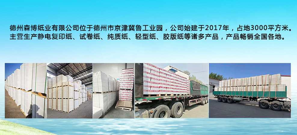 德州森博纸业有限公司位于德州市京津冀鲁工业园,公司始建于2017年,占地3000平方米。公司现有职工20余人,年生产能力10万吨,主营生产司主营指掌天下复印纸、有光纸、书写纸、双胶纸、铜板纸、无碳纸、新闻纸、各种试